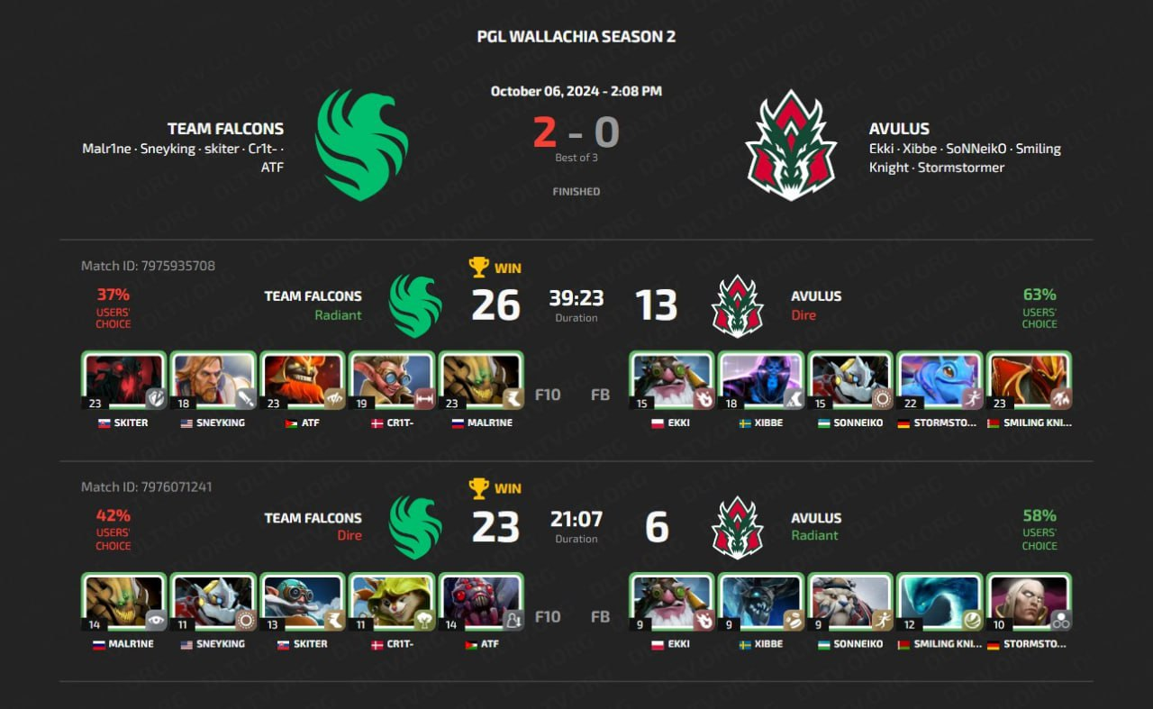 Team Falcons без особых проблем обыграли AVULUS на двух картах. На первой Malr1ne на Sand King засноуболил всю команду, его финальный счёт составил 10/1/13. К слову SoNNeikO отыграл со статистикой 0/10/10. На второй Team Falcons выиграли все линии и закончили игру за 21 минуту. ATF и Cr1t- показали хороший перфоманс, отыграв с KDA 2/0/10 и 8/0/12 соответственно.