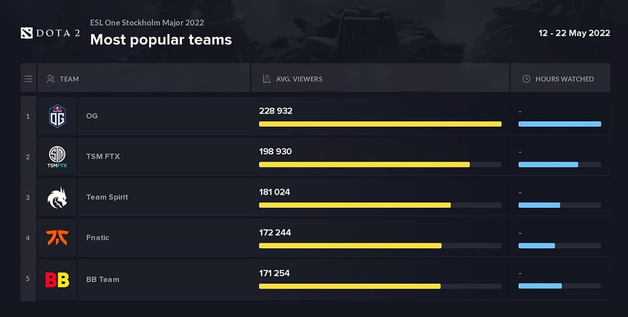 Аналитический портал Esports Charts опубликовал список самых популярных команд прошедшего ESL Stockholm Dota Major 2022. По их данным лидером стала OG, за матчами которой в среднем наблюдало по 229 тыс. зрителей.