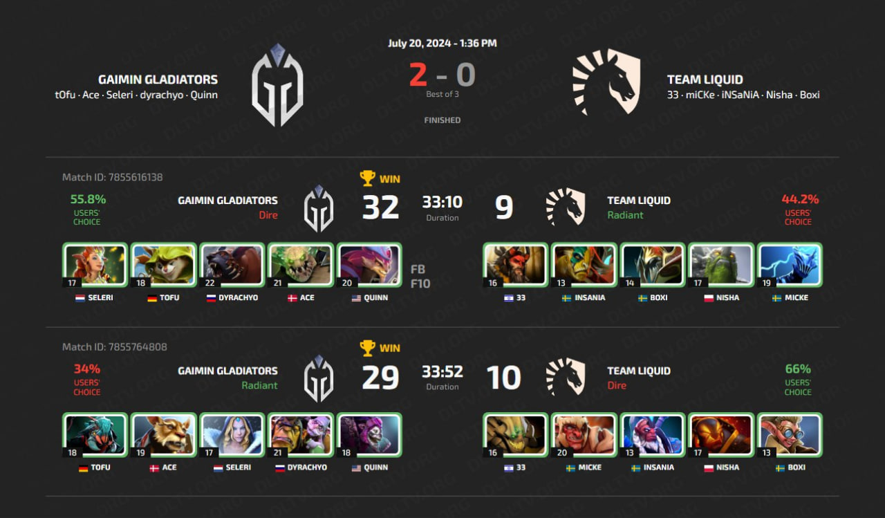 Обе карты получились легкими для Gaimin Gladiators, Team Liquid ни разу за серию не лидировали по нетворсу. За две игры Team Liquid смогли сделать лишь 19 убийств. Забавный момент получился в завершении второй карты. dyrachyo на Alchemist нажал ультимейт, получил Solar Crest от Seleri и Pipe от Ace, из-за чего Team Liquid просто не могли нанести ему урон. dyrachyo с легкостью сломал бараки и вышел. Ситуация повторилась при пуше второй стороны. Gaimin Gladiators сделали семь фрагов без потерь, после чего Team Liquid сдались.