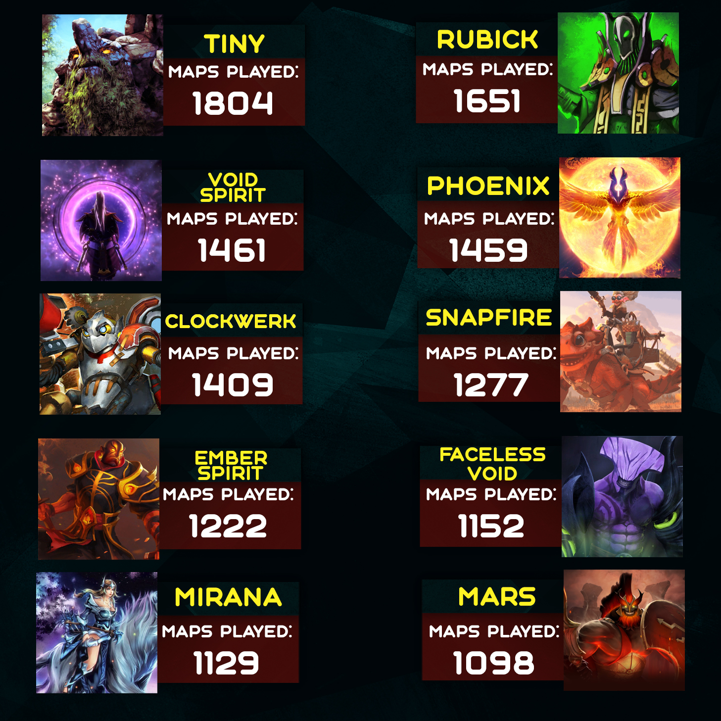 Самым популярным из всех героев оказался Tiny: на момент написания статьи он был выбран на 1804 картах, а это практически треть из всех официальных матчей, сыгранных на 7.27 патче. Результат, конечно, удивительный, но стоит отметить, что Tiny — универсальный герой, использующийся вообще на всех игровых позициях.