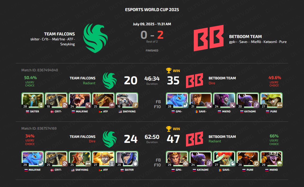 BetBoom Team überraschten in der Draft-Phase. Pure wählte für sich einen Carry Hoodwink und beendete die erste Karte mit einem Score von 10/2/19. Auf der zweiten Karte zeigten Team Falcons endgültig, dass sie nicht in Form sind: skiter machte mehrere Fehler im Spiel und kaufte Aghanim Scepter zu spät, Malr1ne verlor die Midlane und BetBoom Team erwies sich immer wieder als einfach stärker.