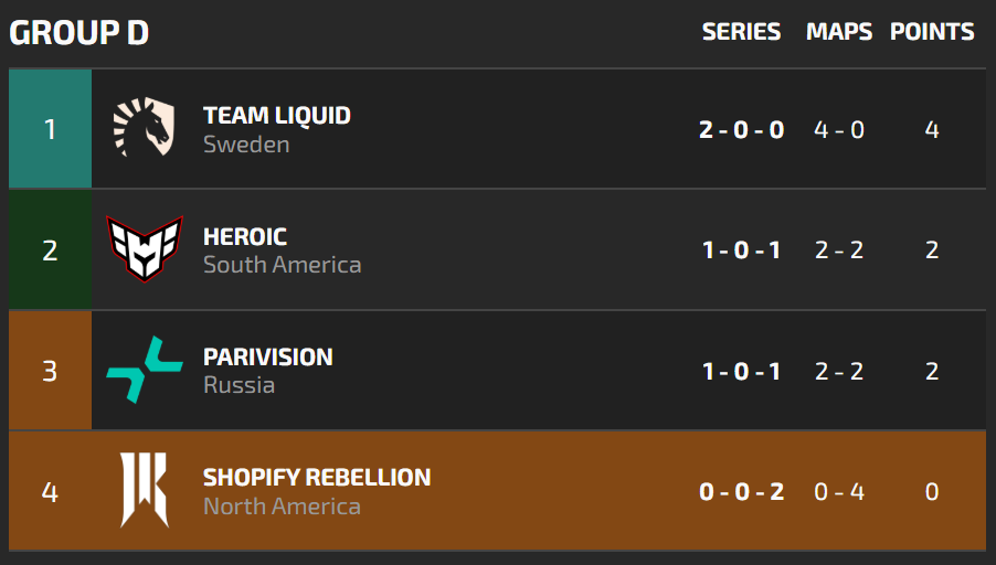 Shopify Rebellion konnten Heroic nicht besiegen, obwohl ihr Kampf auf der zweiten Karte erbittert war. Die Spieler von Shopify Rebellion konnten nicht damit umgehen, eine unter der Nase gefallene Divine of Rapier nach einem Comeback-Fight zu bemerken und unterlagen folgerichtig den Gegnern.