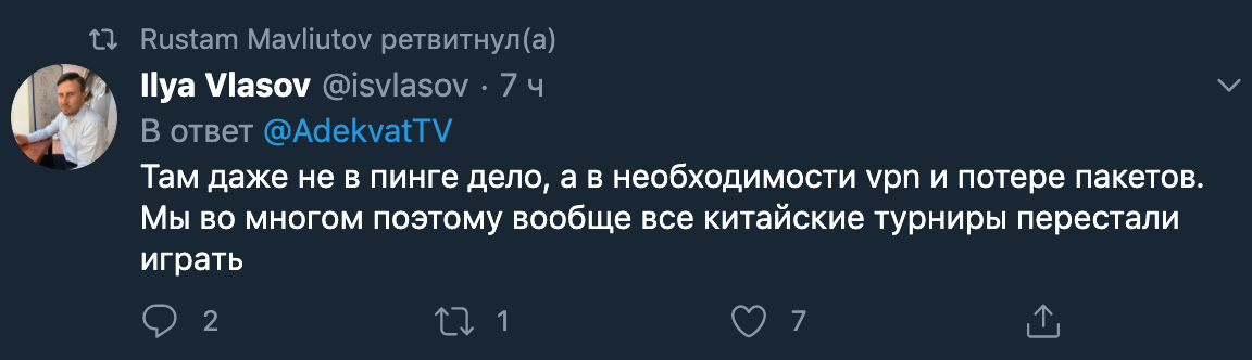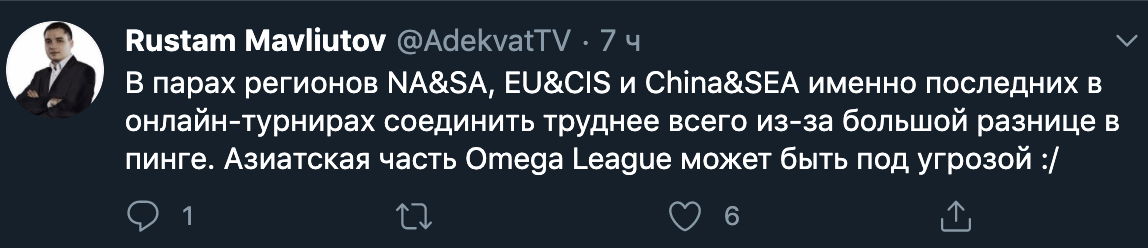Комментатор студии RuHub Рустам "Adekvat" Мавлютов на личной странице в Твиттере написал о проблемах, связанных с пингом, в матчах между командами из Юго-Восточной Азии и Китая.