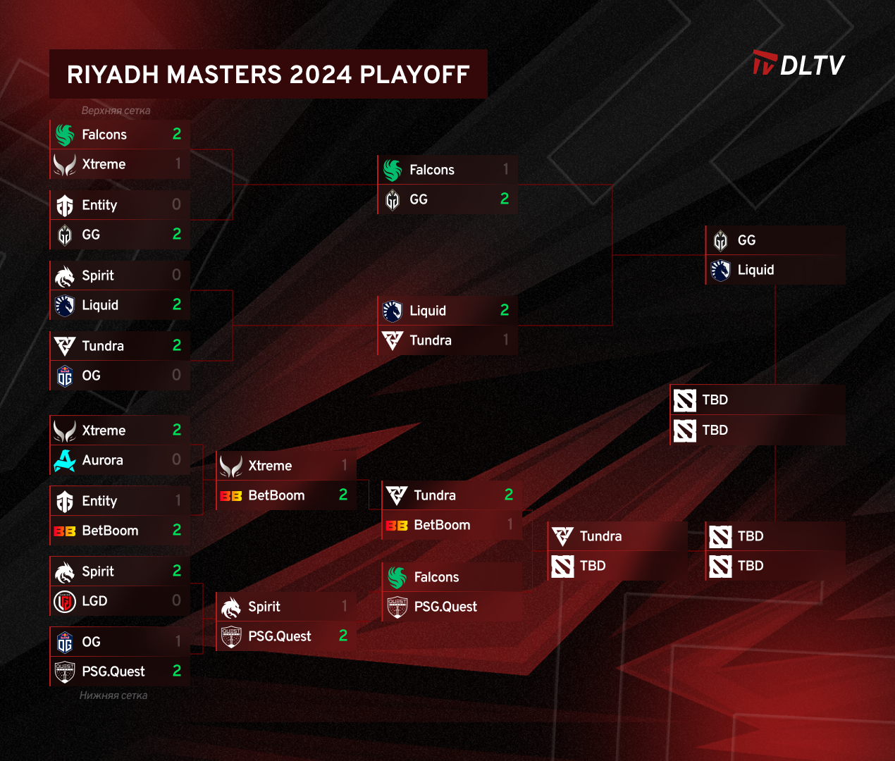 Tundra Esports одолели BetBoom Team в третьем раунде нижней сетки со счетом 2-1, дальше они сыграют с победителем пары Team Falcons - PSG Quest за топ 3 Riyadh Masters 2024. BetBoom Team заняли 5-6 место и заработали 300 тысяч долларов.