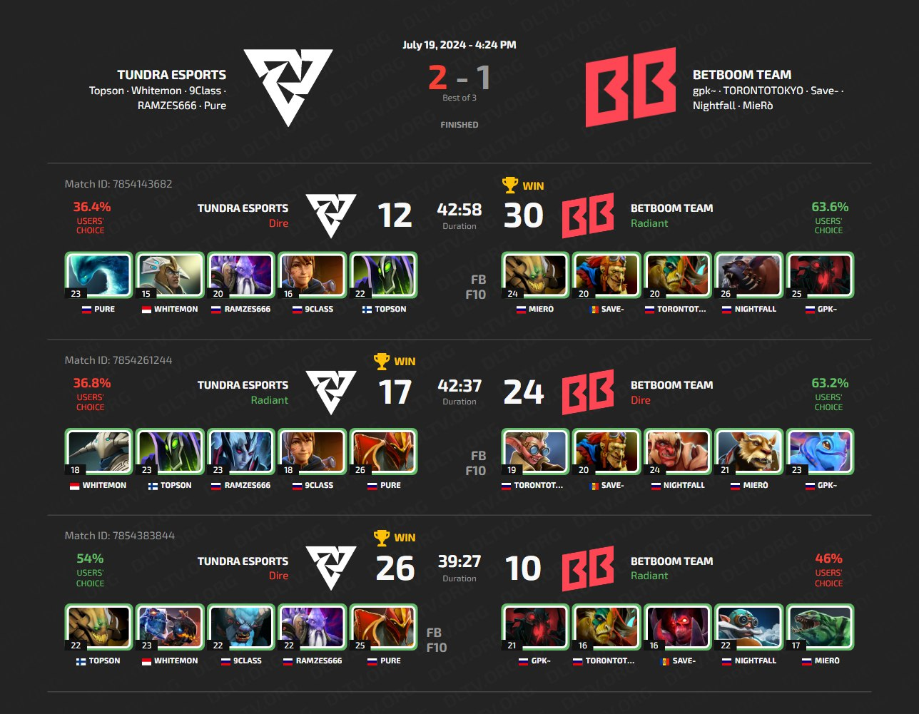 На третьей карте Tundra Esports разгромили BetBoom Team. Драфт ББ оказался намного слабее, чем у их оппонента. Pure на Dragon Knight через аспект с красным драконом невероятно быстро набирал нетворс. Он отыграл со счетом 7/3/15 и нанес больше всех урона.