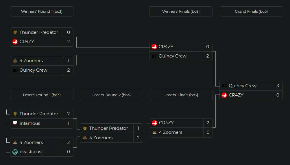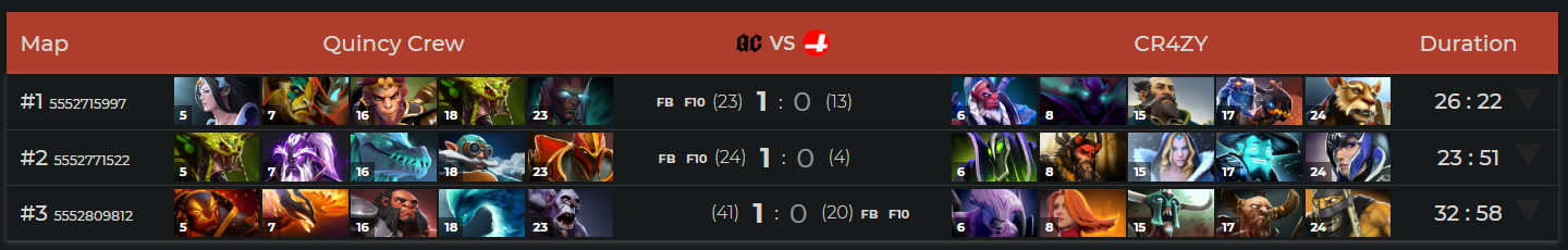 ??Quincy Crew, who easily passed the upper bracket, was already waiting for its opponents in the grand final. The final turned out to be weak, as ??CR4ZY failed to show a decent game. The result was as expected - ??Quincy Crew won with a 3:0 score.