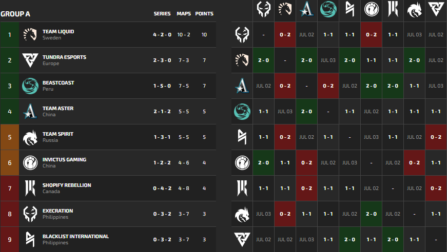 В первом круге Liquid без проблем расправились с Team Spirit на двух картах. В обеих играх “драконы” брали нестандартного Visage для Магомеда 'Collapse' Халилова, но ничего хорошего из этого не вышло. Beastcoast неожиданно оказались сильнее Team Aster и победили со счетом 2-0. Новый керри Beastcoast показал отличную игру на Shadow Fiend в обеих играх. Tundra с тренером на саппорте без проблем обыграли Blacklist, также, на двух картах. Execration и Shopify Rebellion сыграли вничью, причем первую карту SR чуть было не отдали и закончили лишь на 60 минуте. На второй Execration смогли ответить и довольно легко победили.