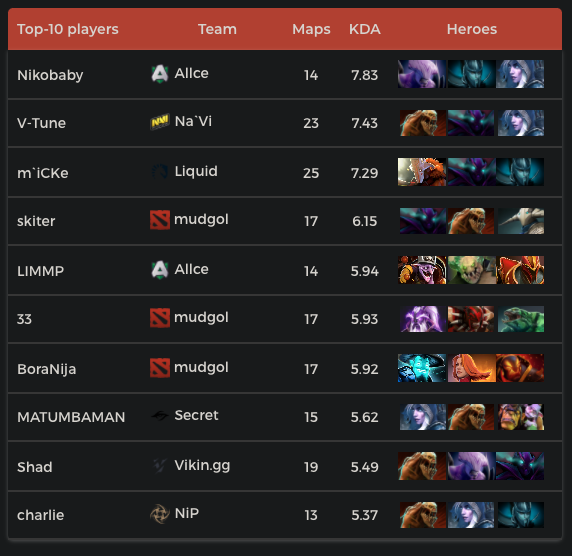TOP-10 players with the highest KDA scores