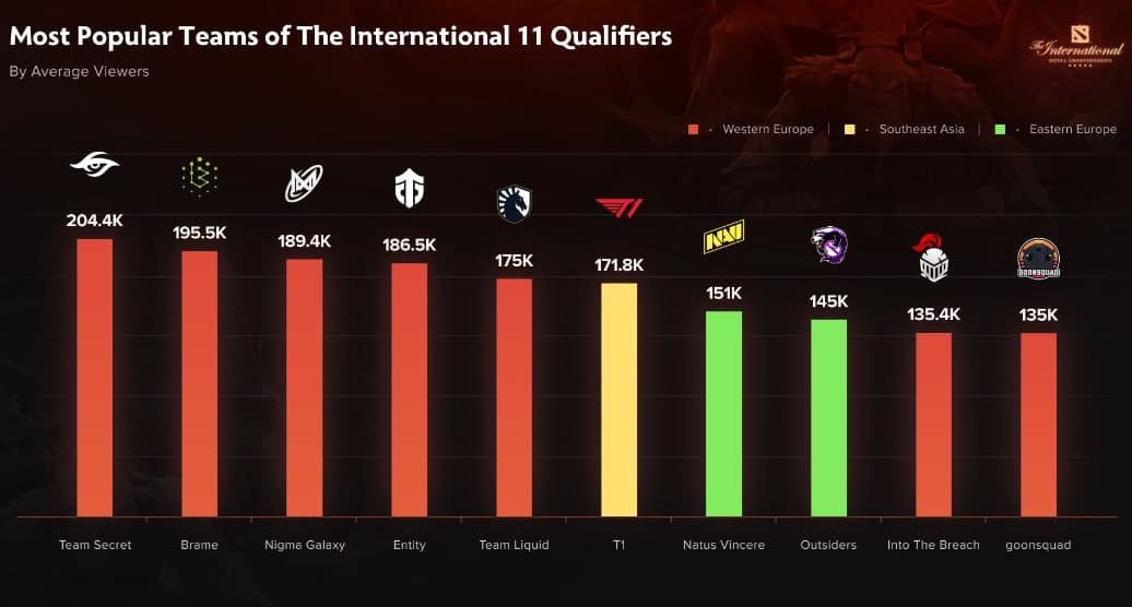 Самой популярной командой отборочных стала Team Secret. В среднем за ее матчами наблюдало порядка 204,400 зрителей. В десятке оказалось всего 3 участника, которые не выступали в Европе — это T1 из Юго-Восточной Азии, а также Natus Vincere и Outsiders из СНГ. Все три команды занимают места с 6 по 8.