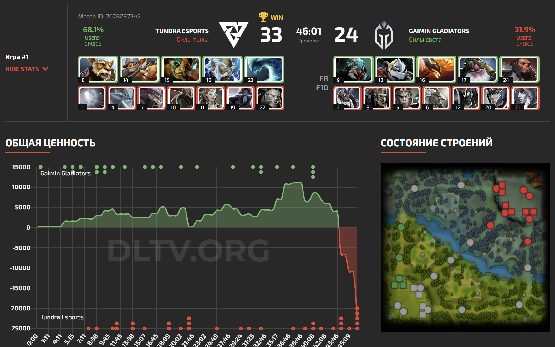 Вторая карта шла полностью по плану Gaimin Gladiators. Гладиаторы выиграли лайны и стали быстро наращивать свое преимущество. На 17 минуте у 9Class возникли неполадки с интернетом, которые он не смог решить за максимально возможную паузу команды в 10 минут, а Gaimin Gladiators, в свою очередь, отказались тратить свое время. Справедливости ради, на минуте дисконнекта коллектив Tundra Esports проигрывал 8 тысяч по золоту и вряд-ли мог на что-то рассчитывать.